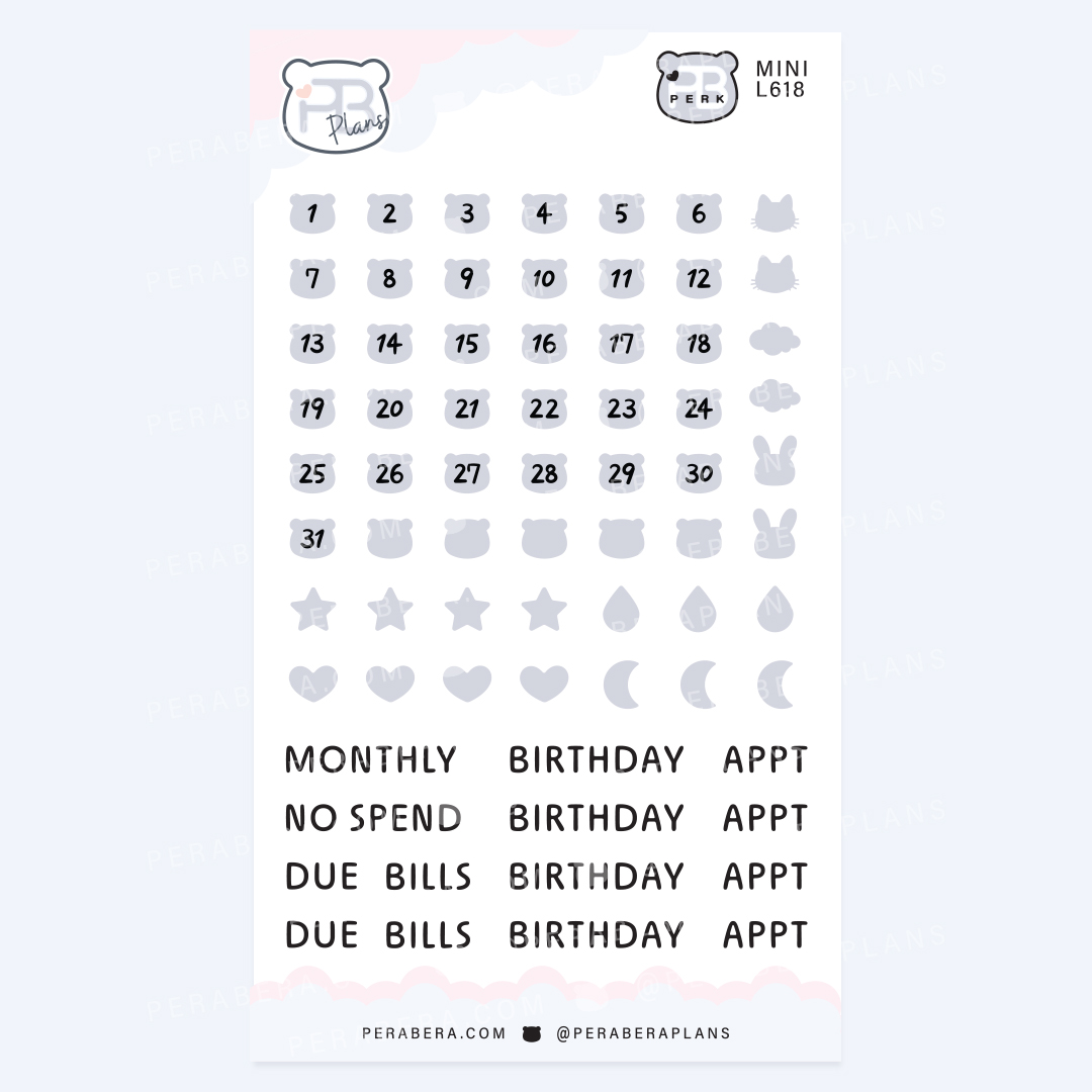 Mini Cute Bear Shape Date Stickers – Functional Work Study Monthly Numbers for Journals – Gray
