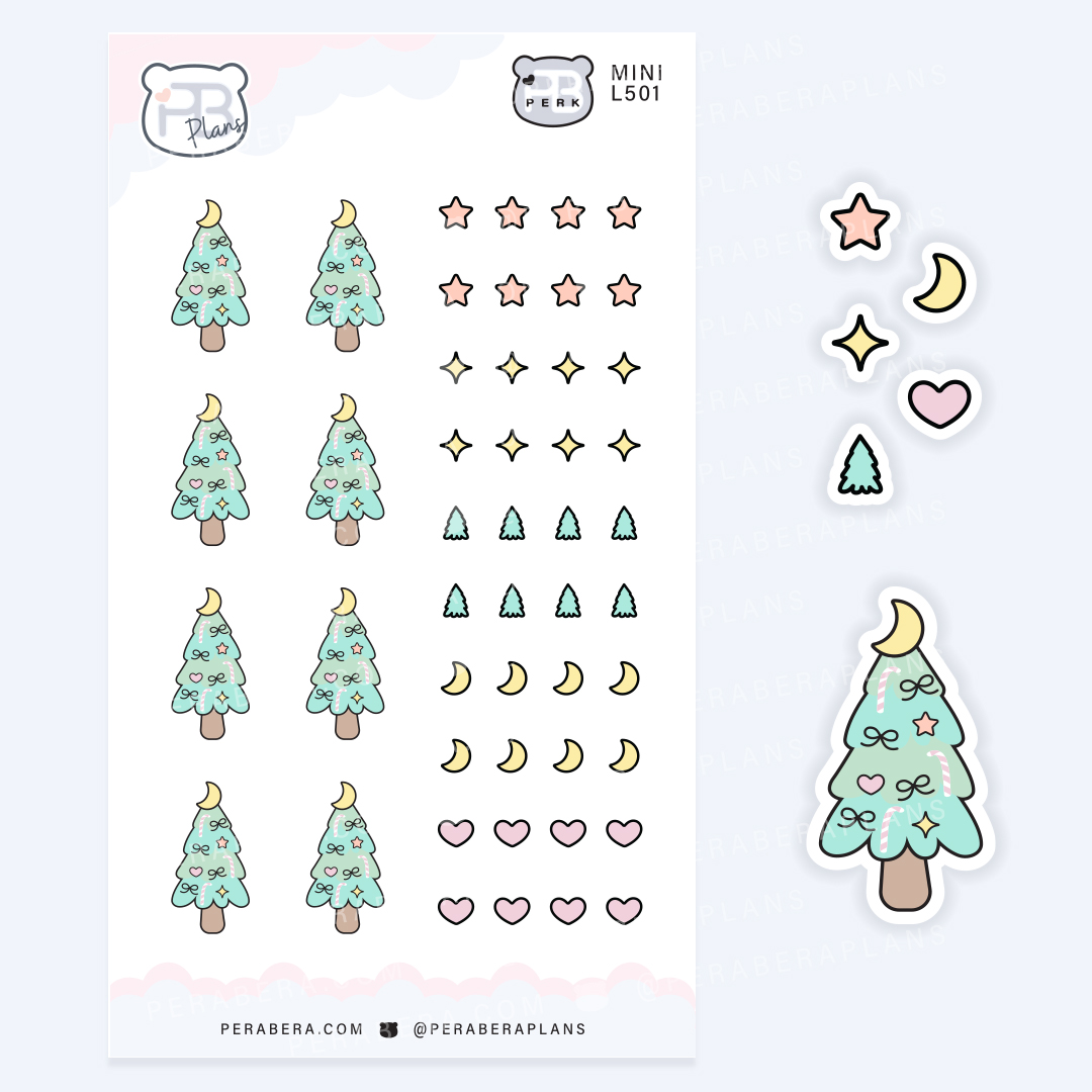 Add some festive sparkle to your planner with these mini Christmas Tree & shapes stickers! Great for Holiday planning and decorating journals. Perfect for keeping track of any project. High-quality, easy-to-stick stickers add a fun and functional touch to your planning routine. Each sheet is about the size of a business card and fits perfectly into your planner pockets, featuring single mini stickers ideal for planning and journaling.